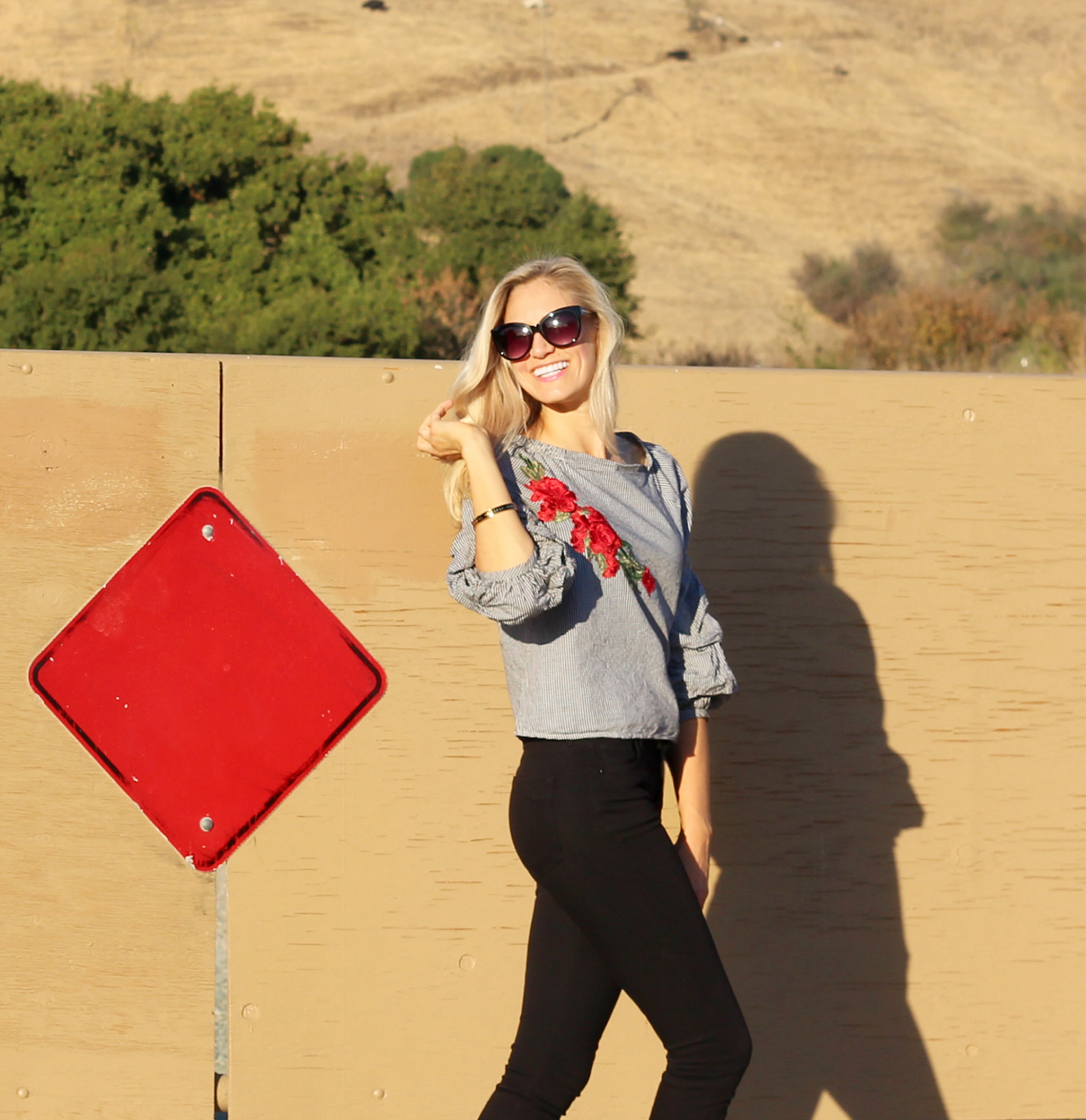This rose embroidered ruffle sleeve top has just enough pattern and a pop of color and the best part is it's just under $20! While I could have paired this outfit with a solid black clutch, I find the pattern play against my top along with a red mani adds a playful twist which is perfect for date night or casual Friday at the office.